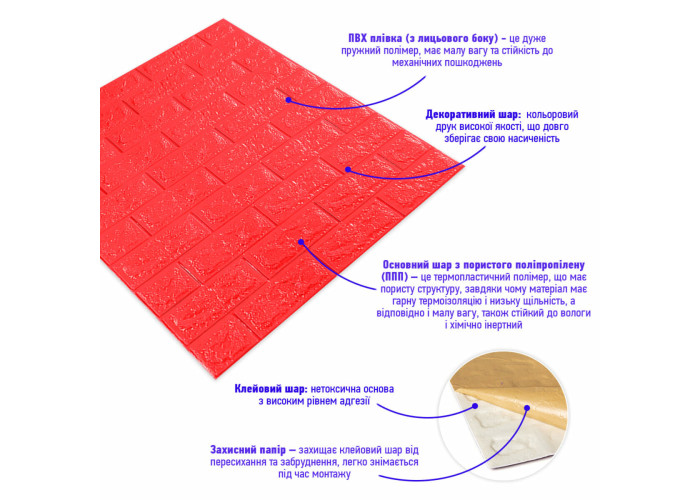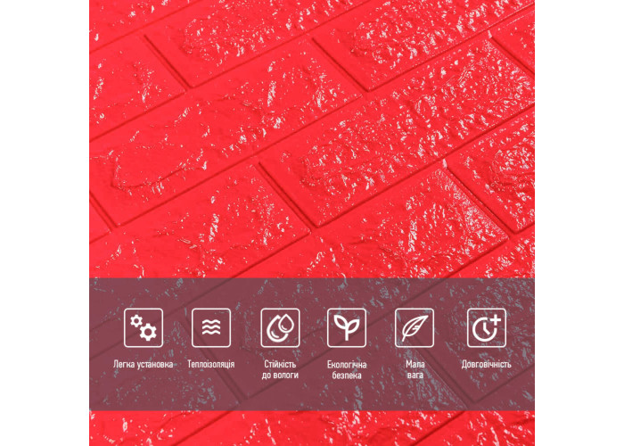 3D панелі самоклеючі – декоративне покриття для стін, виконане з легкого та міцного матеріалу – пористого поліпропілену (ППП). Основна особливість – рельєфний малюнок у вигляді цегли у широкому різноманітті кольорів та наявність клейового шару, що дозволяє встановити панелі без необхідності застосування додаткових матеріалів.