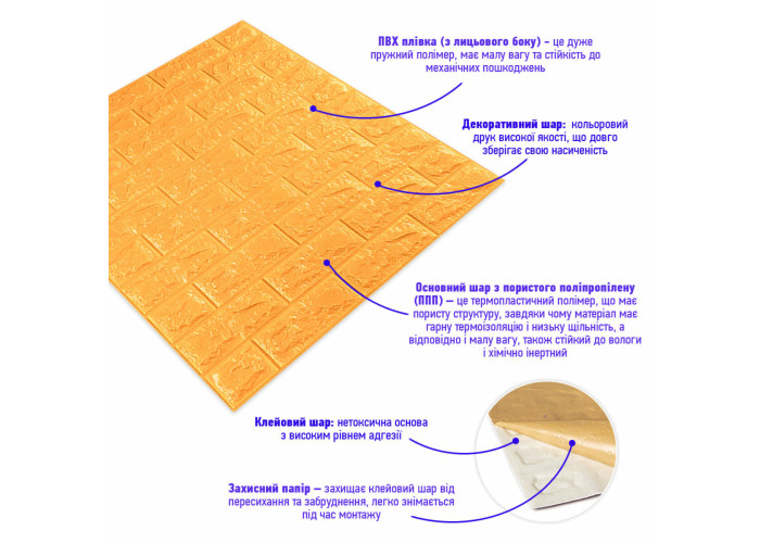 3D панелі самоклеючі – декоративне покриття для стін, виконане з легкого та міцного матеріалу – пористого поліпропілену (ППП). Основна особливість – рельєфний малюнок у вигляді цегли у широкому різноманітті кольорів та наявність клейового шару, що дозволяє встановити панелі без необхідності застосування додаткових матеріалів.