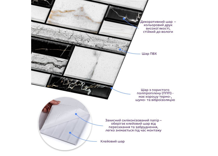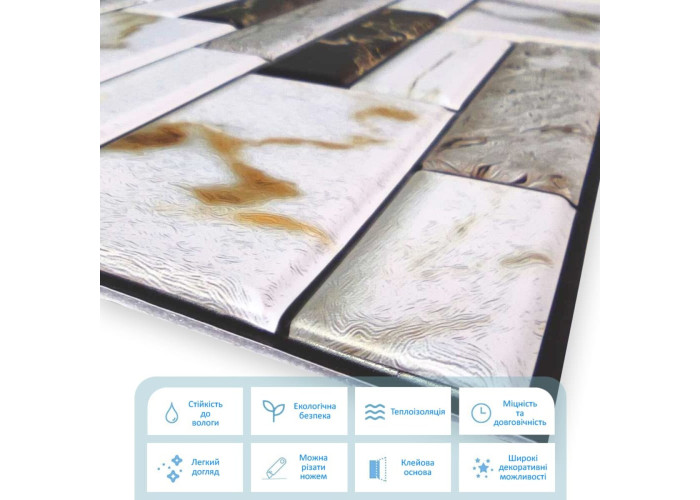 Самоклеючі декоративні панелі СПП - новинка у світі самоклейок. Це невеликі плитки із трендовим малюнком під натуральні матеріали. Прозорий захисний шар із поліуретану захищає покриття від стирання та механічних пошкоджень.