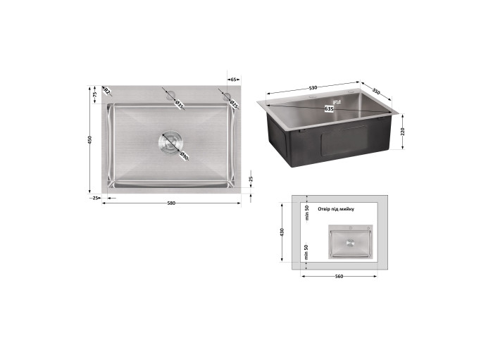 Мийка, сифон, слив/перелив, кошиковий вентиль, дозатор, кріплення.
