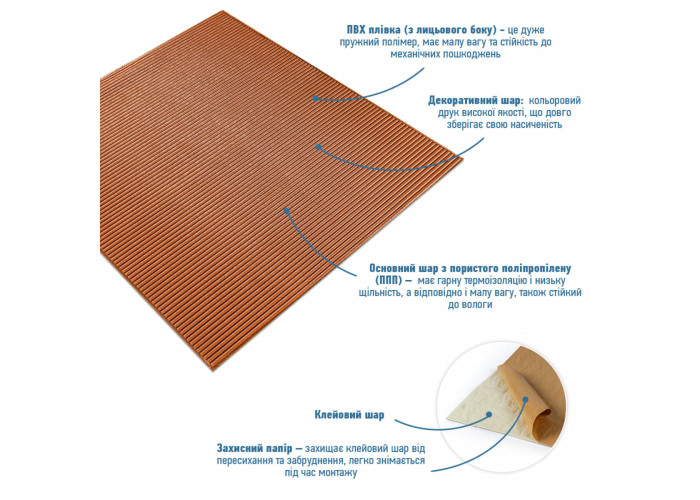 3. Легкість монтажу: наявність клейового шару дозволяє встановити панелі без необхідності застосування додаткових матеріалів.