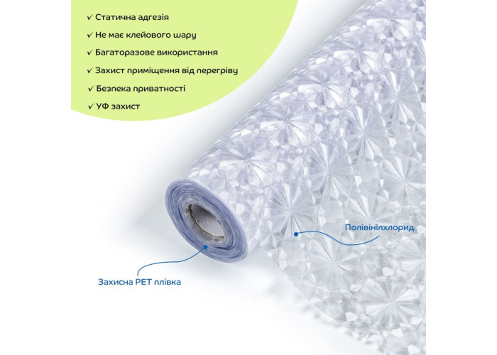 Віконна ПВХ-плівка – це декоративний матеріал, призначений для прикраси скляних поверхонь. Вона забезпечує приватність, захищає від ультрафіолетового випромінювання та додає естетичної привабливості вашому інтер'єру. Легко наноситься на будь-яке скло, перетворюючи його на непрозору поверхню та обмежуючи видимість через скло.