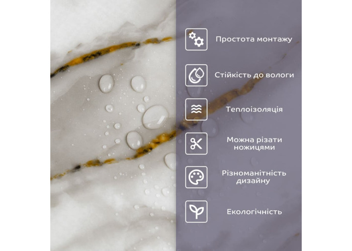 - 1. Легкість та міцність: плитка легка та міцна, що спрощує її логістику, установку та забезпечує довгий термін служби. Матеріал легкий в установці, можна різати ножицями чи монтажним ножем, не потребує додаткових матеріалів чи спеціалістів. Між смугами не розходиться, не роздмухується і не деформується. Відсоток обрізу становить 1%, що є найкращим показником для настінних покриттів;