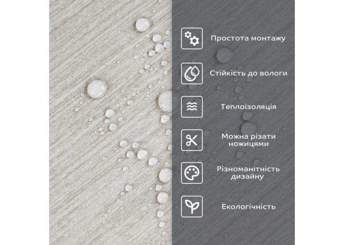 - 1. Легкість та міцність: плитка легка та міцна, що спрощує її логістику, установку та забезпечує довгий термін служби. Матеріал легкий в установці, можна різати ножицями чи монтажним ножем, не потребує додаткових матеріалів чи спеціалістів. Між смугами не розходиться, не роздмухується і не деформується. Відсоток обрізу становить 1%, що є найкращим показником для настінних покриттів;