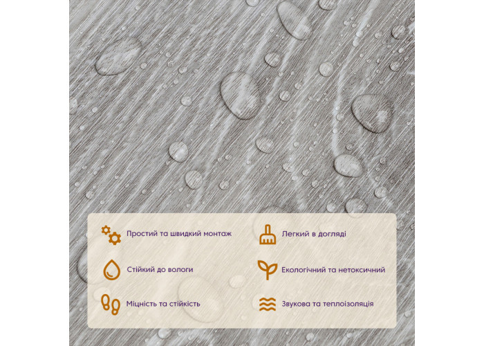 • Стійкість до вологи: вінілова плитка під ламінат стійка до вологи, що робить її відмінним вибором для кухні та інших приміщень з підвищеною вологістю, матеріал стійкий також до впливу пари та до появи плісняви.