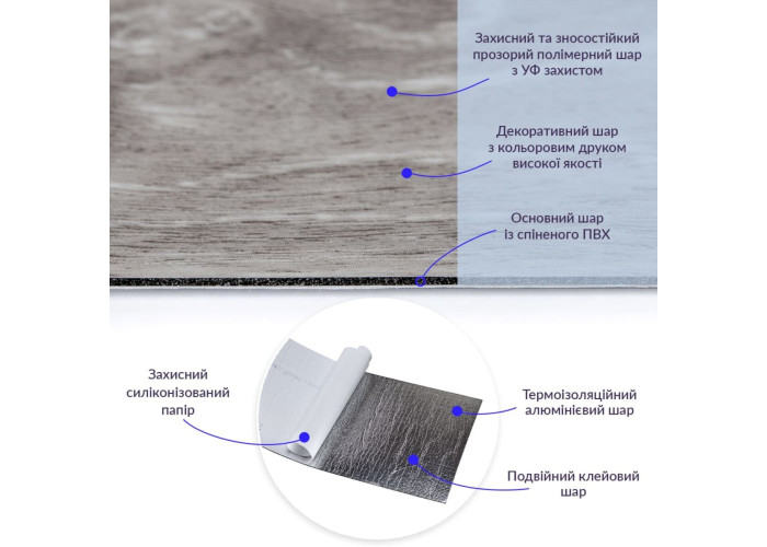 • Полімерний шар (прозорий), що захищає від потертостей та дрібних механічних пошкоджень, забезпечує довговічність використання, а УФ захист допомагає запобігти вигоранню, зберігаючи колір насиченим, внаслідок чого вініловий ламінат довго має свій первісний естетичний вигляд.