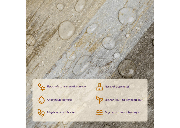 • Стійкість до вологи: вінілова плитка під ламінат стійка до вологи, що робить її відмінним вибором для кухні та інших приміщень з підвищеною вологістю, матеріал стійкий також до впливу пари та до появи плісняви.