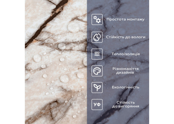 2. Стійкість до вологи: вінілова плитка стійка до вологи, що робить її відмінним вибором для ванних кімнат, кухонь та інших приміщень з підвищеною вологістю, матеріал стійкий також до впливу пари, а також до появи плісняви. Плитка підходить для створення фартуха кухні, можна клеїти біля плити на відстані не менше ніж 30-50 см;