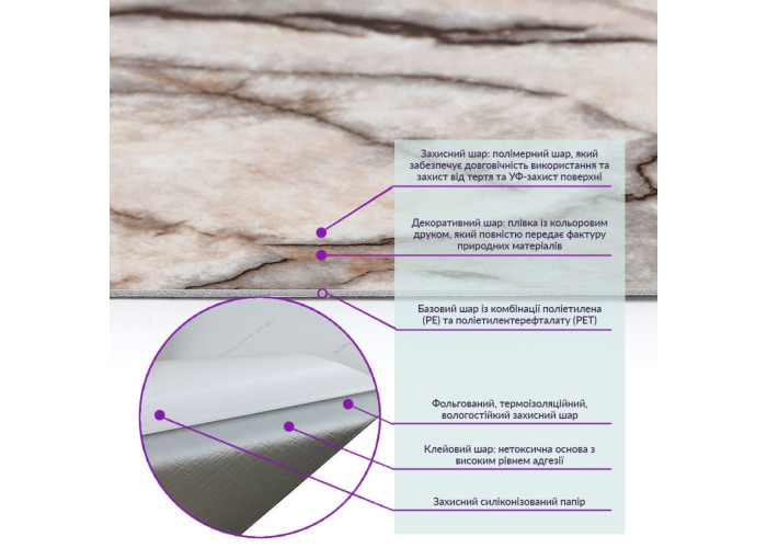 1. Полімерний шар: захищає від потертостей та дрібних механічних пошкоджень, забезпечує довговічність використання, а УФ захист допомагає запобігти вигоранню, зберігаючи колір насиченим.