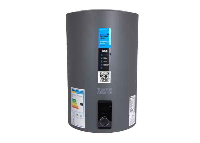 Електричний водонагрівач Thermo Alliance об’ємом 80 л у сірому кольорі призначений для вертикального монтажу та оснащений сухим ТЕНом потужністю 2,0 кВт, що зменшує утворення накипу та підвищує надійність роботи. Внутрішній антикорозійний захист бака, ефективна теплоізоляція та продумана конструкція забезпечують стабільний нагрів води, економне енергоспоживання і тривалий строк служби.