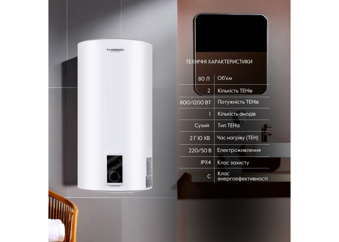 Водонагрівач Thermo Alliance Slim 80 л D80V20J(D)2-K встановлюють для організації гарячого водопостачання господарсько-побутового призначення. Внутрішню поверхню бака захищає від корозії магнієвий анод та емалеве покриття. Нагрівання води виконують два сухих ТЕНа. Відсутність прямого контакту з водою дозволяє нагрівальним елементам закритого типу служити довго й надійно. В інструкції є всі необхідні відомості про монтаж й експлуатацію бойлера. Товщина внутрішнього бака - 2 мм.