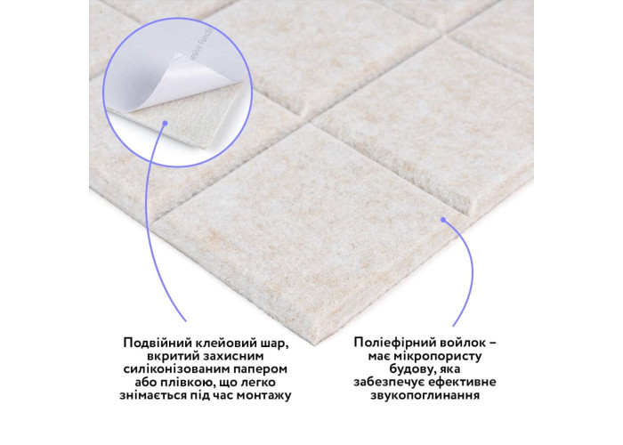 Самоклеючі звукоїзоляційні панелі –це багатошаровий оздоблювально-функціональний матеріал, призначений для зниження рівня шуму та покращення акустики приміщення. Основу панелей становить пресований поліефірний войлок, який забезпечує ефективну звуко- й додаткову теплоізоляцію, поєднуючи легку вагу з високою стійкістю до деформацій. Завдяки клейовому шару панелі швидко монтуються, а однотонна поверхня з виразним 3D-ефектом (під рейку або цеглу) поєднує технічні властивості з сучасним декоративним виглядом.
