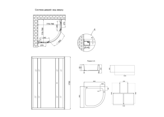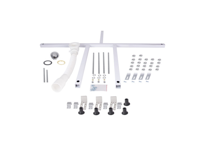 Профіль, подвійні ролики, ручки, комплект кріпильних деталей, глухе скло, скляні двері, піддон, сифон, ніжки, панель для піддону.