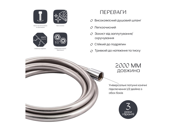 Шланг для душу Qtap Hadice PVC200C виготовлено з полімеру хромованного кольору, тому до переваг можна віднести гнучкість виробу, захист від протікання і розшаровування. Окрім цього, він прослужить довше у порівнянні з обплетенням з металу чи пластику. Завдяки гладкій поверхні шланг легко і швидко миється, досить провести по ньому губкою з м'яким миючим засобом.