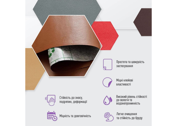 - Екологічна перевага: самоклейна екошкіра виготовляється без використання тваринного шкіряного матеріалу, тому вона є більш екологічною альтернативою натуральній шкірі.