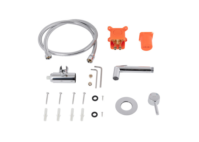 Лійка для гігієнічного душу, змішувач, душовий шланг, ключ, кріпильні деталі.