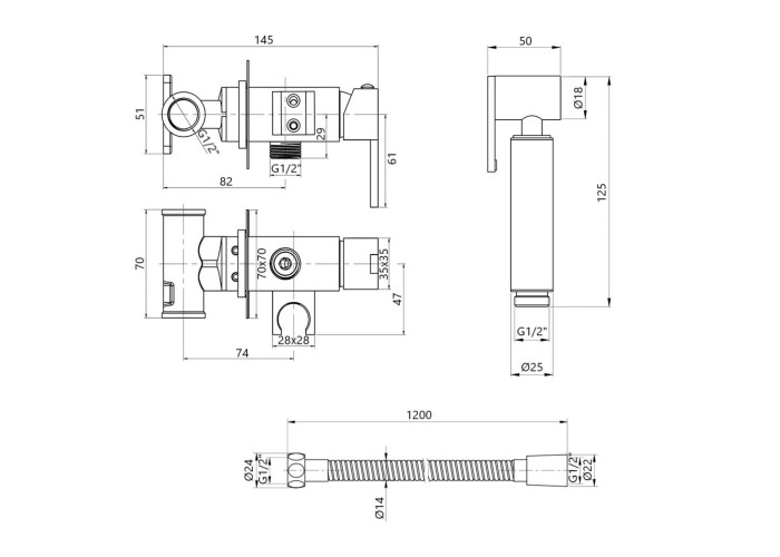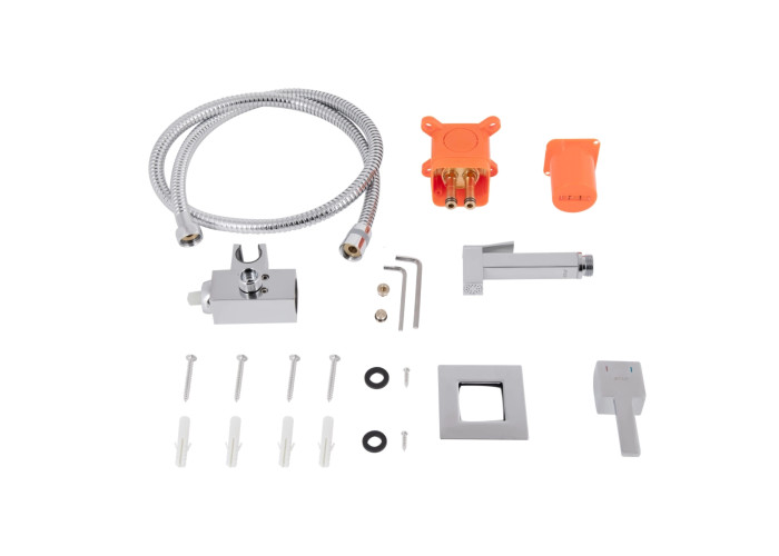 Лійка для гігієнічного душу, змішувач, шлангове під'єднання, душовий шланг, ключ, кріпильні деталі.