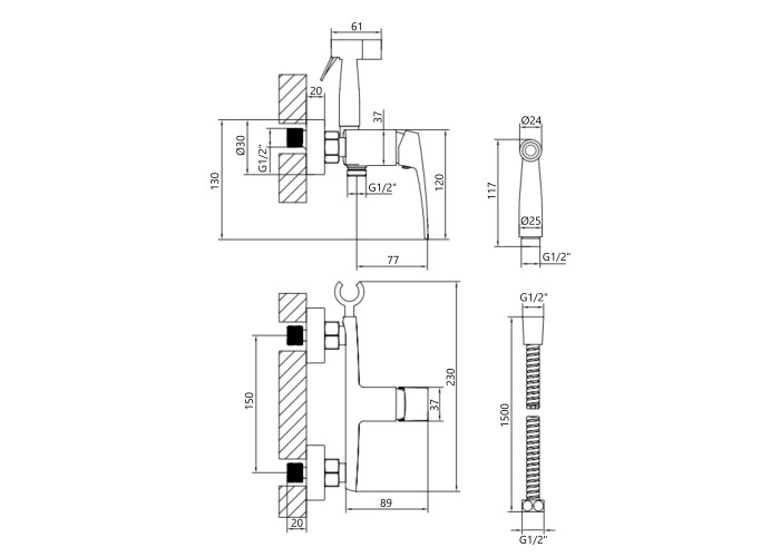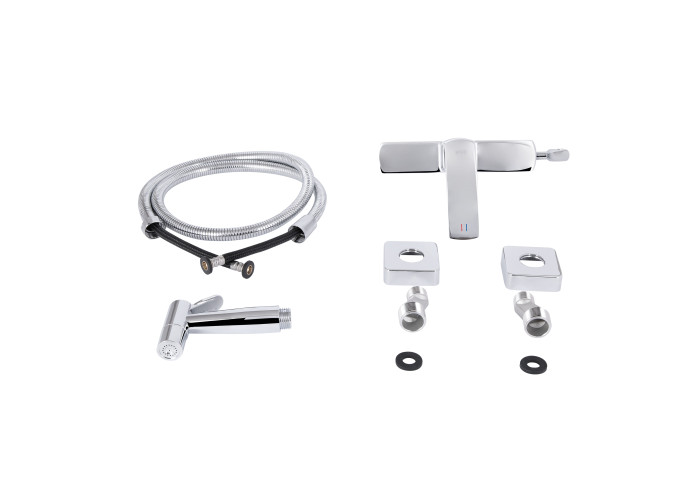 Змішувач, лійка для гігієнічного душу, шланг, кріплення.
