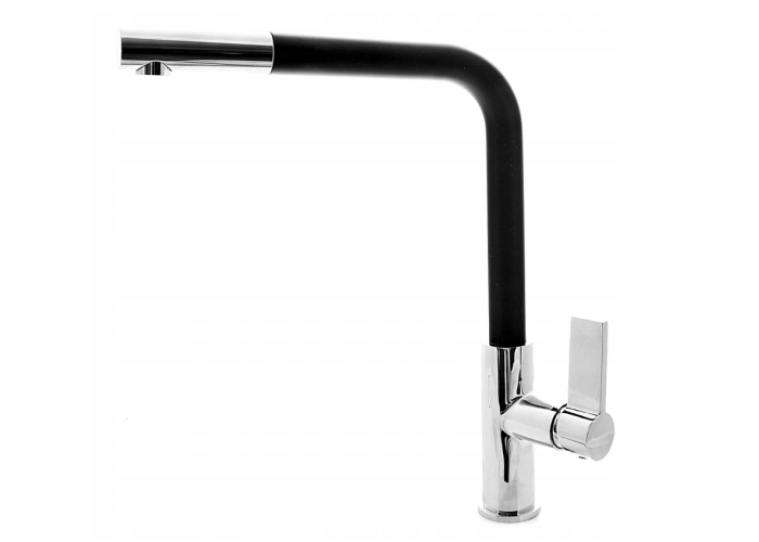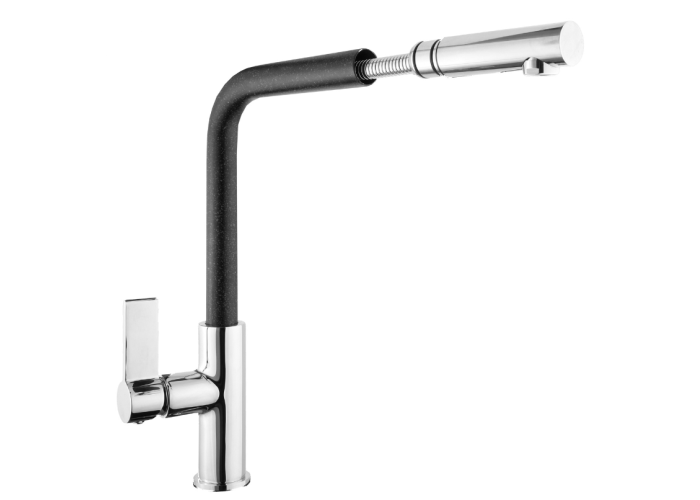 Змішувач для кухні GRANITAN LINEA з якісним висувним виливом - виготовлений з латуні, чорного кольору. Покриття змішувача стійке до знебарвлення та високих температур.