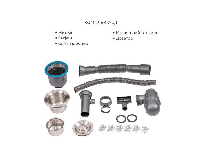 Нержавіюча сталь - мийка; латунь / пластик - дозатор; нержавіюча сталь / пластик - кошик