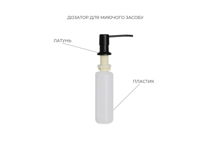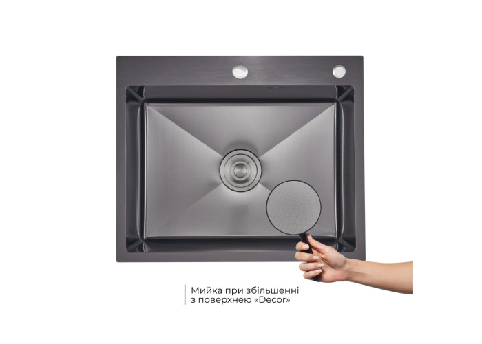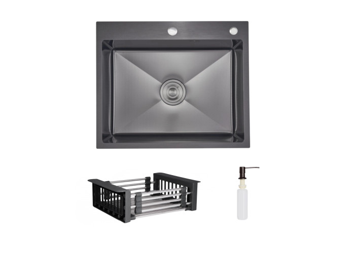 Інтегрована мийка з нержавіючої сталі з ефектним чорним покриттям Black PVD та рельєфним малюнком Honeycomb. У наборі – дозатор та кошик для повного комплекту кухонного оснащення.