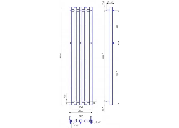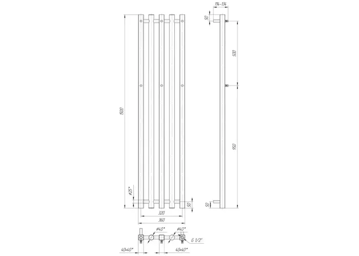 Розміри: висота - 1500 мм, ширина - 360 мм, глибина 107 мм, міжцентрова відстань для підключення - 320 мм, діаметр підключення G1/2''.;