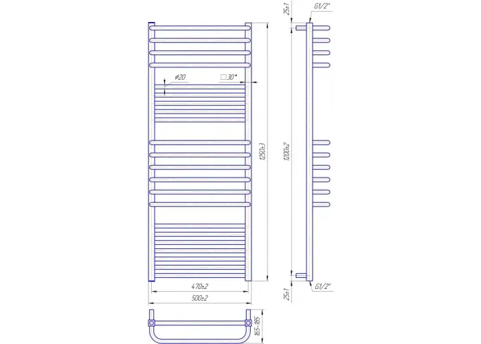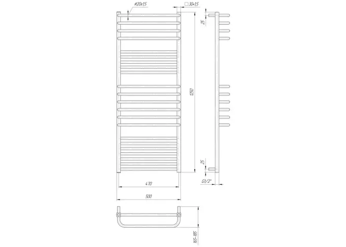 Розміри: висота - 1250 мм, ширина - 500 мм, глибина 170 мм, міжцентрова відстань для підключення - 470 мм, діаметр підключення G1/2''.;