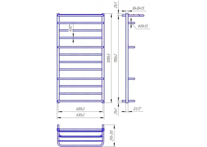 Розміри: висота - 1200 мм, ширина - 630 мм, глибина 295 мм, міжцентрова відстань для підключення - 600 мм, діаметр підключення G1/2''.;