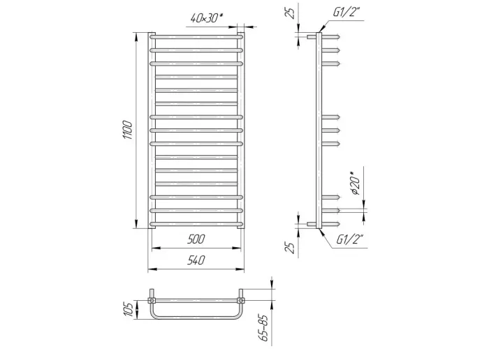 Розміри: висота - 1100 мм, ширина - 540 мм, глибина 170 мм, міжцентрова відстань для підключення - 500 мм, діаметр підключення G1/2''.;