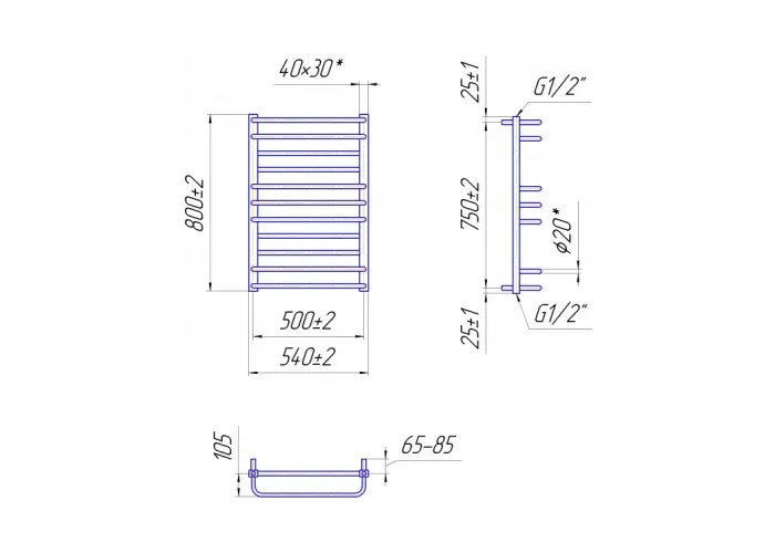 Розміри: висота - 800 мм, ширина - 540 мм, глибина 170 мм, міжцентрова відстань для підключення - 500 мм, діаметр підключення G1/2''.;