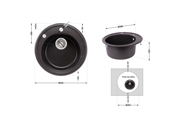 Мийка, сифон, злив/перелив, корзинчастий вентиль, кріплення.