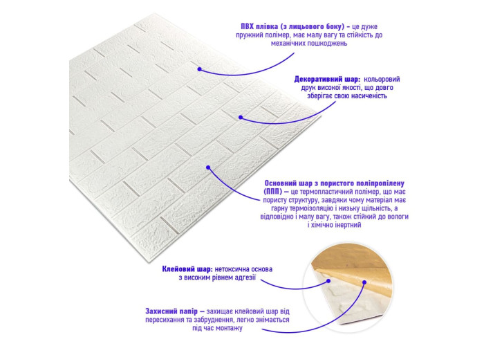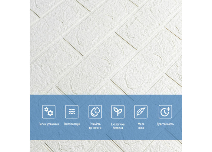 3D панелі самоклеючі – декоративне покриття для стін, виконане з легкого та міцного матеріалу – пористого поліпропілену (ППП). Основна особливість – рельєфний малюнок у вигляді цегли у широкому різноманітті кольорів та наявність клейового шару, що дозволяє встановити панелі без необхідності застосування додаткових матеріалів.