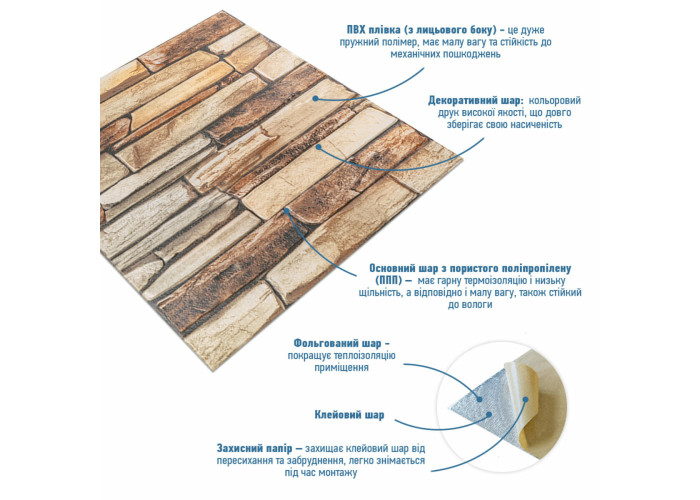 - Легкість монтажу: наявність клейового шару дозволяє встановити панелі без необхідності застосування додаткових матеріалів.