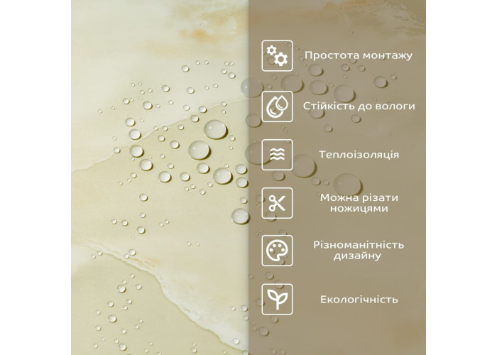 - 1. Легкість та міцність: плитка легка та міцна, що спрощує її логістику, установку та забезпечує довгий термін служби. Матеріал легкий в установці, можна різати ножицями чи монтажним ножем, не потребує додаткових матеріалів чи спеціалістів. Між смугами не розходиться, не роздмухується і не деформується. Відсоток обрізу становить 1%, що є найкращим показником для настінних покриттів;