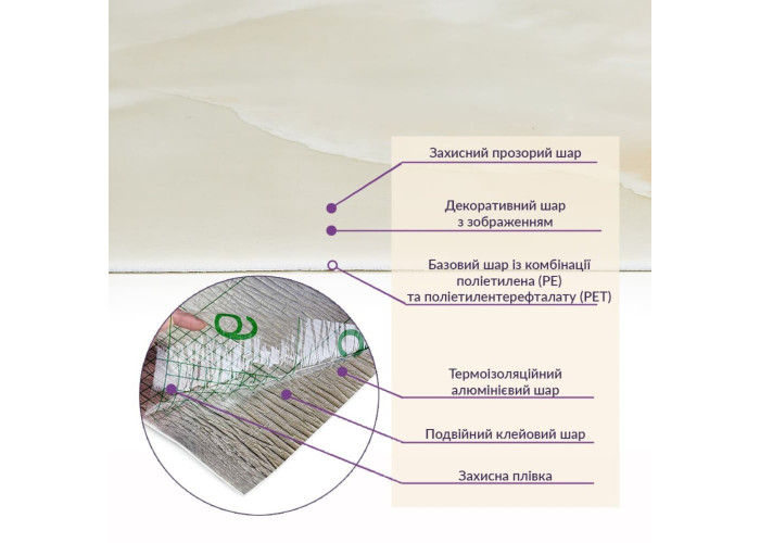 - 3. Ізоляція: плитка має звукову та теплоізоляцію завдяки наявності повітряних прошарків та додатковому алюмінієвому шару;