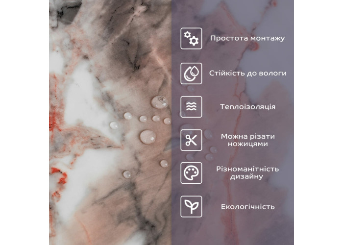 - 1. Легкість та міцність: плитка легка та міцна, що спрощує її логістику, установку та забезпечує довгий термін служби. Матеріал легкий в установці, можна різати ножицями чи монтажним ножем, не потребує додаткових матеріалів чи спеціалістів. Між смугами не розходиться, не роздмухується і не деформується. Відсоток обрізу становить 1%, що є найкращим показником для настінних покриттів;
