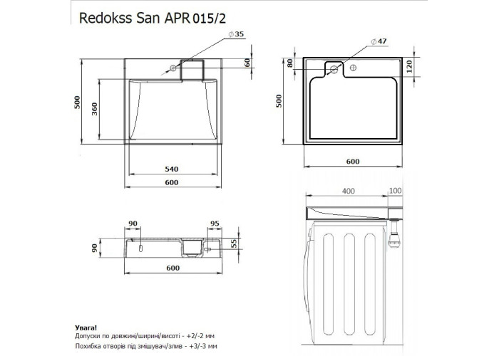Акриловий умивальник Redokss San FOBOS 60х50см - для встановлення над пральною машиною до 40 см.
