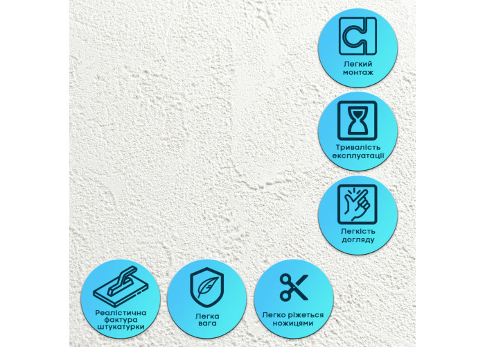 Матеріал є еластичним і легко згинається, що дозволяє монтувати його на нерівні та складні поверхні. Завдяки вбудованій армувальній сітці штукатурка не розтягується, не створює заломів і не деформується під час монтажу або експлуатації. Це гарантує стабільну геометрію та акуратний вигляд після наклеювання.