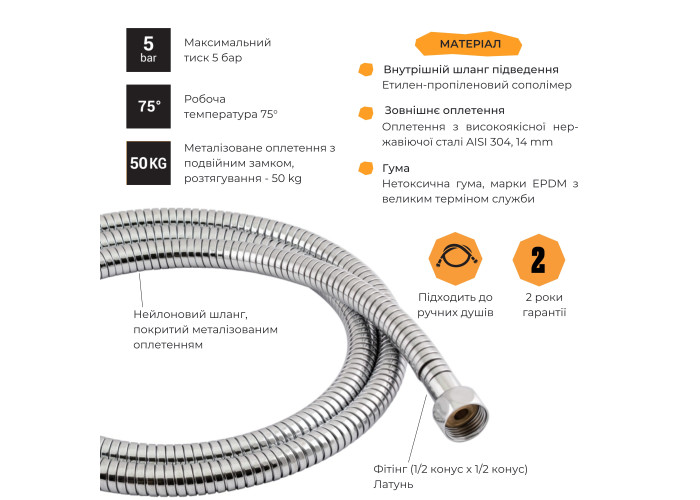 Шланг для душу Lidz (CRM) 50 13 150 00 виконано у вигляді металевого витка з хромованою поверхнею, що не так схильна до зношування. Виріб такого виду є класичним варіантом шлангів, які найчастіше використовуються в душі. Для підключення є підведення з внутрішнім різьбленням. Універсальне підключення дає можливість використовувати зі шлангом будь-яку лійку.