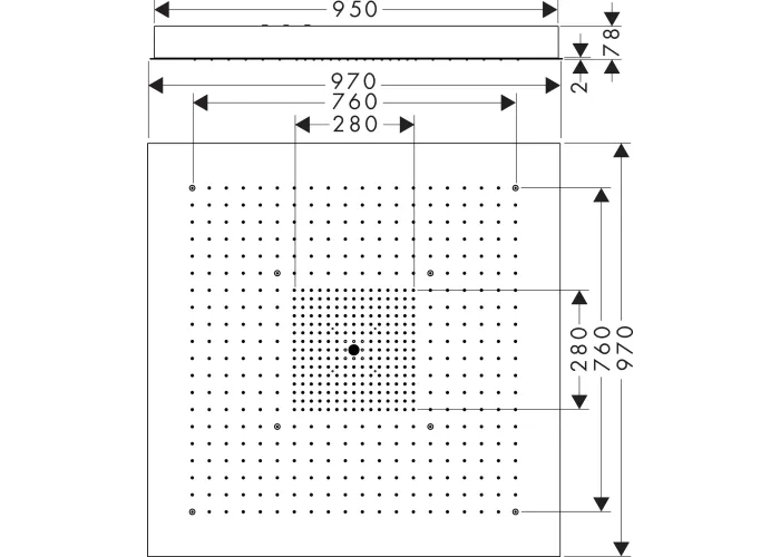 зони струменів: Bodyzone - зовнішня зона стельового душу, Rainzone - внутрішня зона стельового душу з функцією AirPower, ламінарний струмінь - Ø 17 мм;