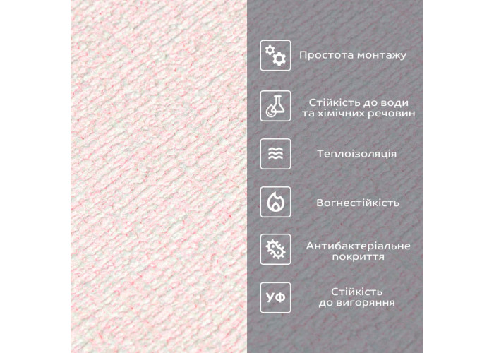 - Прінтована полімерна плівка - має антибактеріальні властивості, стійкість до вологи, хімічних речовин і температури. -захист допомагає запобігти вигоранню, зберігаючи колір насиченим, за рахунок чого шпалери довго зберігають свій первісний естетичний вигляд