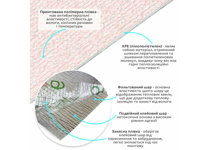 - Теплоізоляція: Спінений ХРЕ і фольгований шар забезпечують хорошу теплоізоляцію, що допомагає підтримувати комфортну температуру в приміщенні.