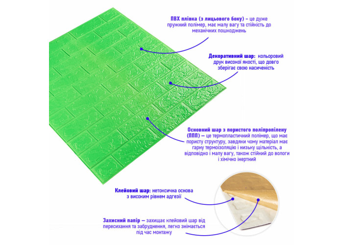 3D панелі самоклеючі – декоративне покриття для стін, виконане з легкого та міцного матеріалу – пористого поліпропілену (ППП). Основна особливість – рельєфний малюнок у вигляді цегли у широкому різноманітті кольорів та наявність клейового шару, що дозволяє встановити панелі без необхідності застосування додаткових матеріалів.