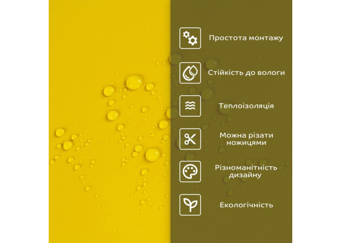 • 1. Легкість та міцність: плитка легка та міцна, що спрощує її логістику, установку та забезпечує довгий термін служби. Матеріал легкий в установці, можна різати ножицями чи монтажним ножем, не потребує додаткових матеріалів чи спеціалістів. Між смугами не розходиться, не роздмухується і не деформується. Відсоток обрізу становить 1%, що є найкращим показником для настінних покриттів;