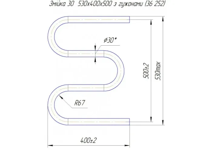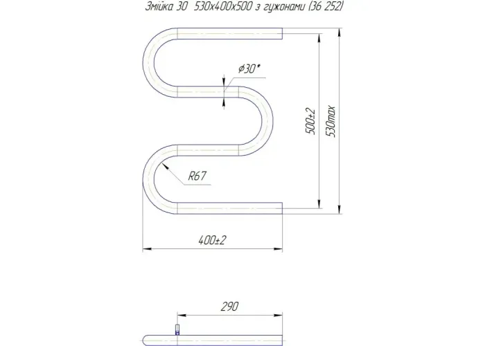 Водяна рушникосушарка Змійка ∅30 530х400 з міжцентровою відстанню для підключення 500мм, діаметр підключення G 1/2' 3 згина. Рушникосушарка Змійка 30 з боковим підключенням виробляється на нашому підприємстві Маріо з 1998 року.