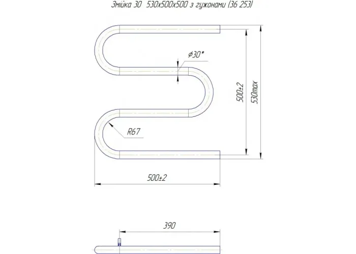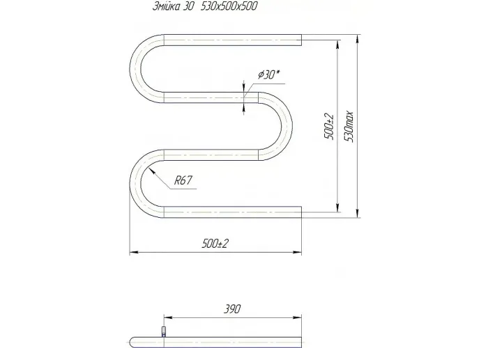 Водяна рушникосушарка Змійка ∅30 530х500 з міжцентровою відстанню для підключення 500мм, діаметр підключення G 1/2'' 3 згина. Рушникосушарка Змійка 30 з боковим підключенням виробляється на нашому підприємстві Маріо з 1998 року.