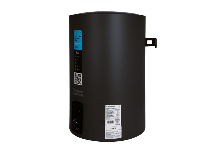 Електричний водонагрівач Thermo Alliance об’ємом 100 л у чорному кольорі призначений для вертикального монтажу та оснащений сухим ТЕНом потужністю 2,0 кВт, що мінімізує утворення накипу та підвищує надійність роботи. Конструкція з окремим розміщенням нагрівального елемента, внутрішній антикорозійний захист бака та ефективна теплоізоляція забезпечують стабільний нагрів води, економне енергоспоживання і тривалий строк служби.