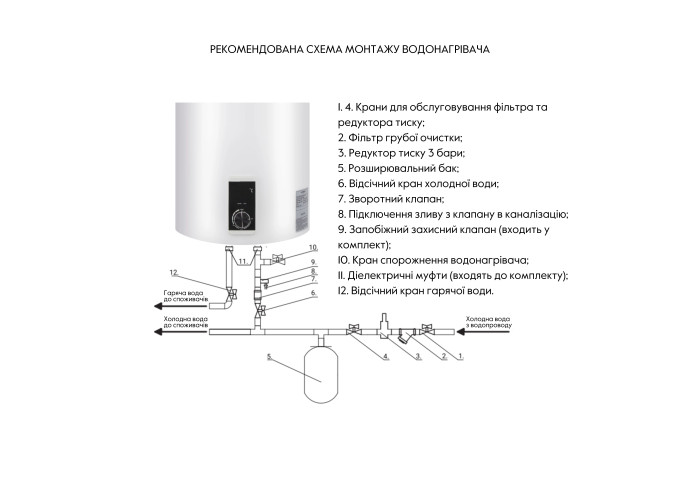 Водонагрівач, кабель з євровилкою, комплект кріплення, інструкція, гарантійний талон, запобіжний клапан