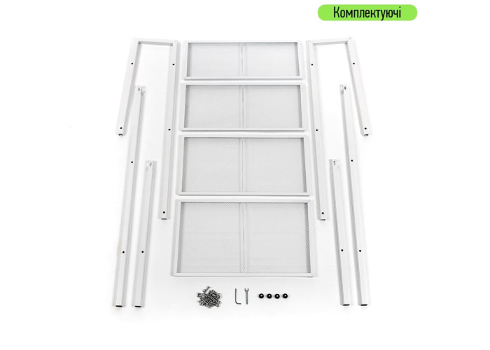 Кожен стелаж є міцною металевою конструкцією, виконаною зі збірного сталевого профілю і сітчастих полиць. Стелажі пофарбовані білою глянсовою емаллю для захисту від корозії та довговічності.