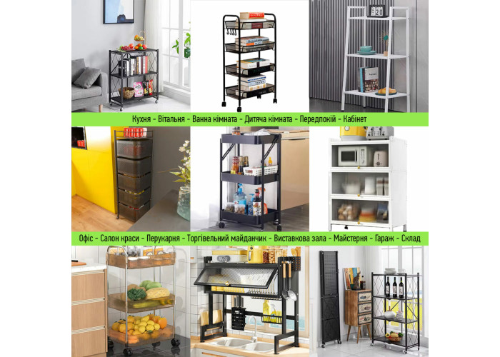 У кухонних зонах вони ідеально підходять для зберігання овочів та фруктів, продуктів харчування, спецій, води та напоїв, посуду та кухонних аксесуарів. У ванних кімнатах ці стелажі чудово справляються з розміщенням рушників та засобів особистої гігієни (як сухих, так і вологих). У вітальні вони можуть служити для організації книг, декоративних елементів та інших дрібниць, роблячи простір більш впорядкованим та зручним.